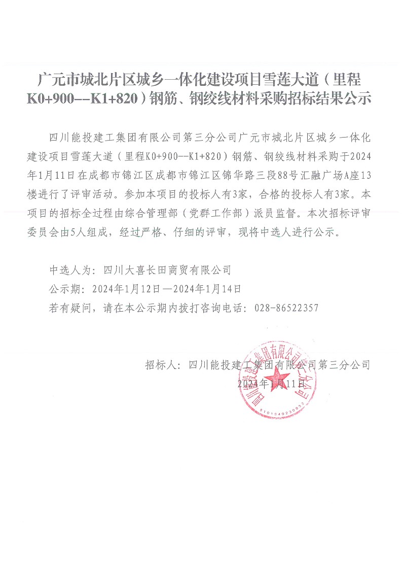 广元市城北片区城乡一体化建设项目雪莲大道(里程K0+900--K1+820)钢筋、钢绞线材料采购招标结果公示