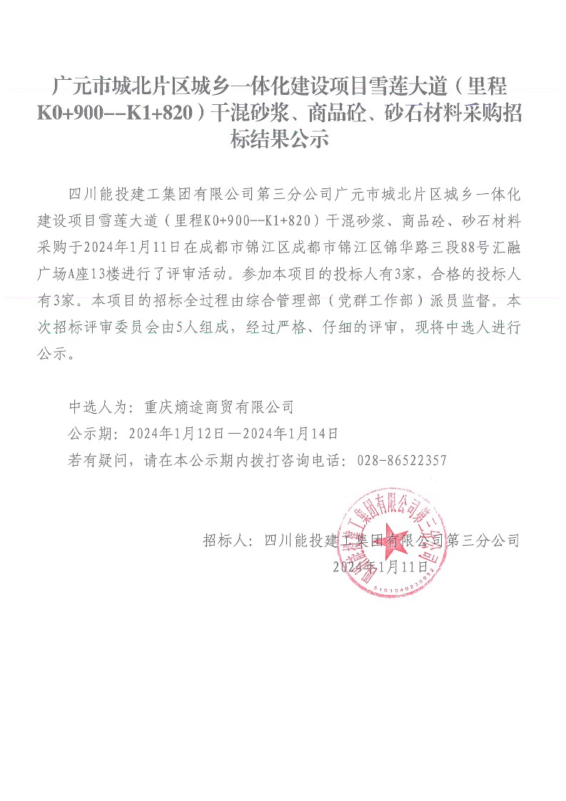 广元市城北片区城乡一体化建设项目雪莲大道(里程K0+900--K1+820)干混砂浆、商品砼、砂石材料采购招标结果公示