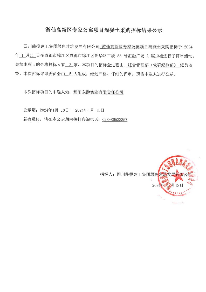 游仙高新区专家公寓项目混凝土采购招标结果公示