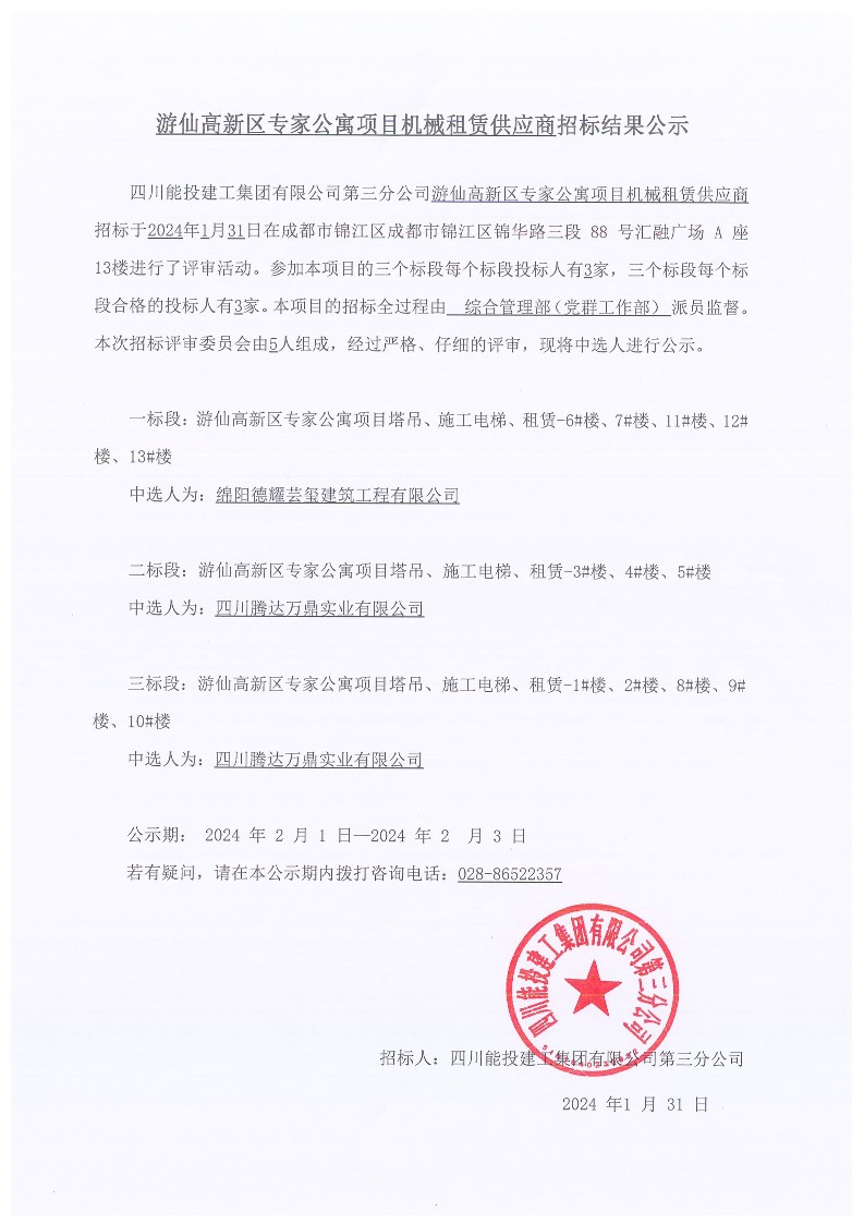 游仙高新区专家公寓项目机械租赁供应商结果公示