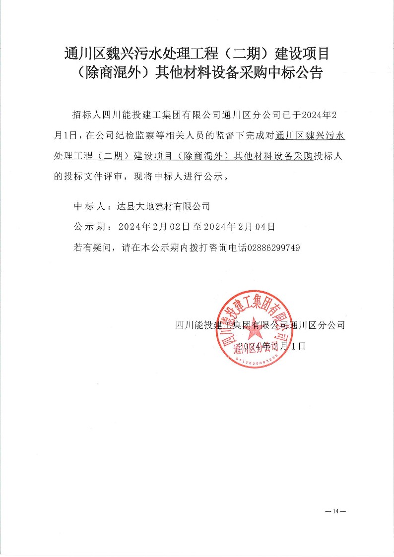 通川区魏兴污水处理工程(二期)建设项目(除商混外)其他材料设备采购中标公告