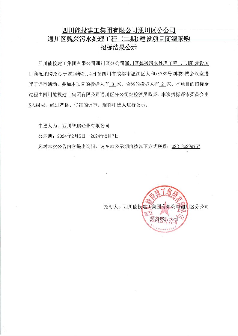 通川区魏兴污水处理工程(二期)建设项目商混采购结果公示