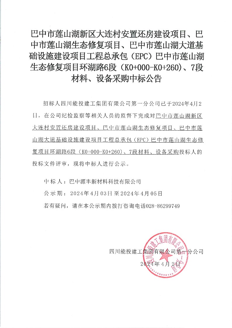 巴中市莲山湖生态修复项目环湖路6段(K0+000-K0+260)、7段材料设备采购中标公告