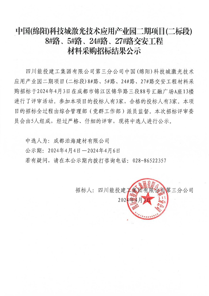 中国(绵阳)科技城激光技术应用产业园二期项目 (二标段)8#路、5#路、24#路、27#路交安工程材料采购招标结果公示