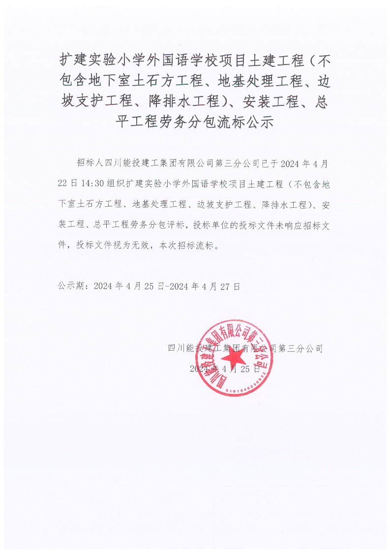 扩建实验小学外国语学校项目土建工程(不包含地下室土石方工程、地基处理工程、边坡支护工程、降排水工程)、安装工程、总平工程劳务分包流标公示