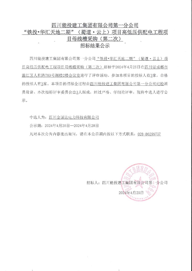 “铁投·华汇天地二期”(蜀道·云上)项目高低压供配电工程项目母线槽采购(第二次)结果公示