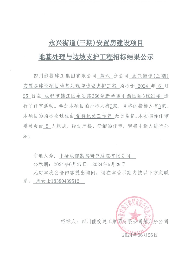 永兴街道(三期)安置房建设项目地基处理与边坡支护工程结果公示