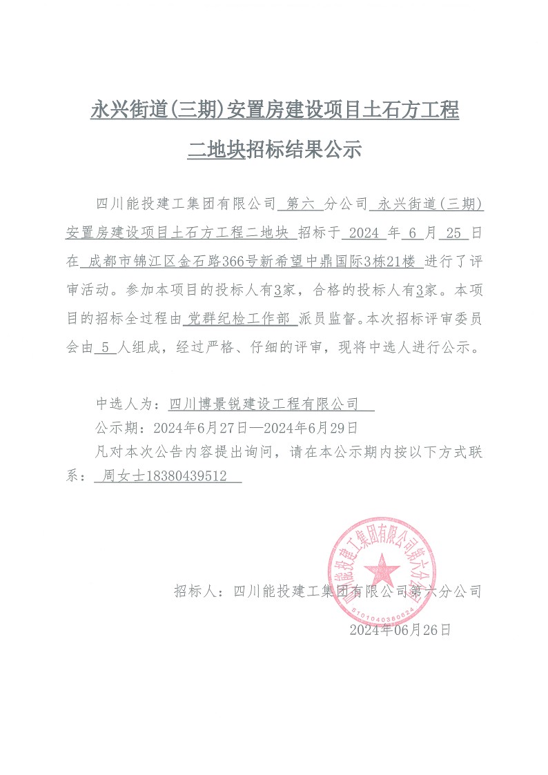 永兴街道(三期)安置房建设项目土石方工程二地块结果公示