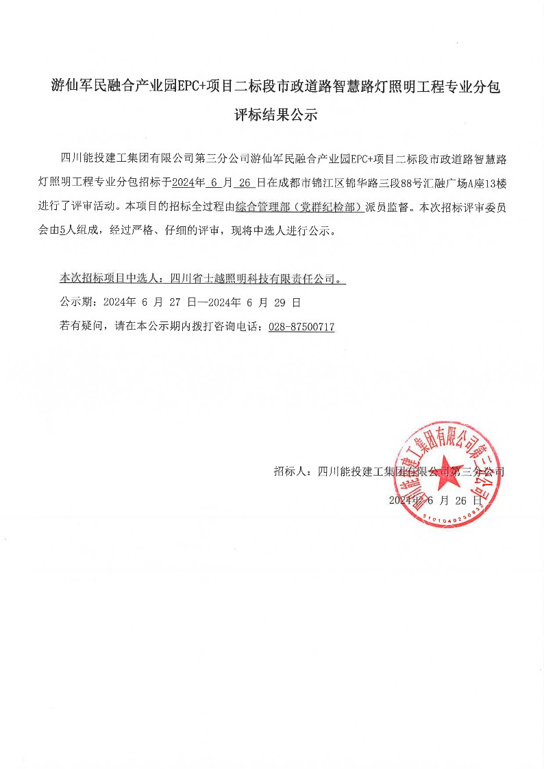 游仙军民融合产业园EPC+项目二标段市政道路智慧路灯照明工程专业分包结果公示
