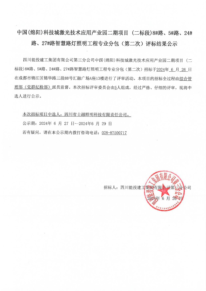 中国(绵阳)科技城激光技术应用产业园二期项目(二标段)8#路、5#路、24#路、27#路智慧路灯照明工程专业分包(第二次)结果公示