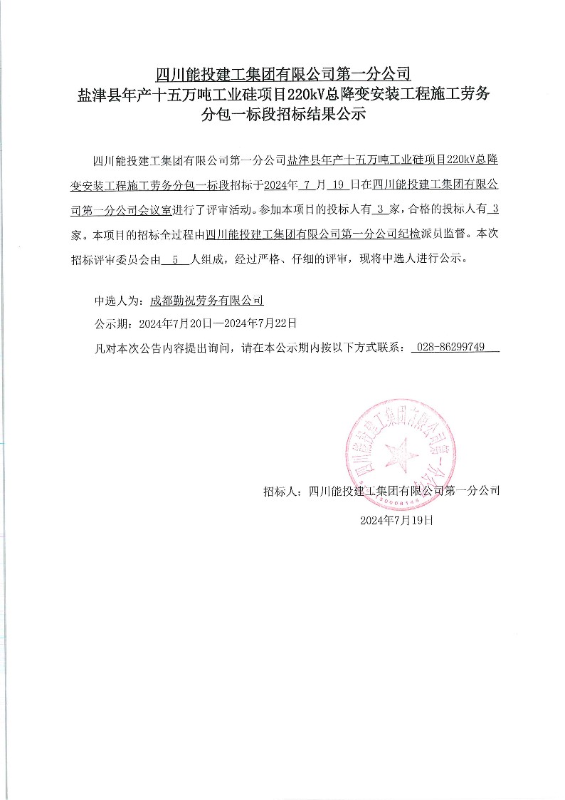 盐津县年产十五万吨工业硅项目220KV总降变安装工程施工劳务分包一标段结果公示