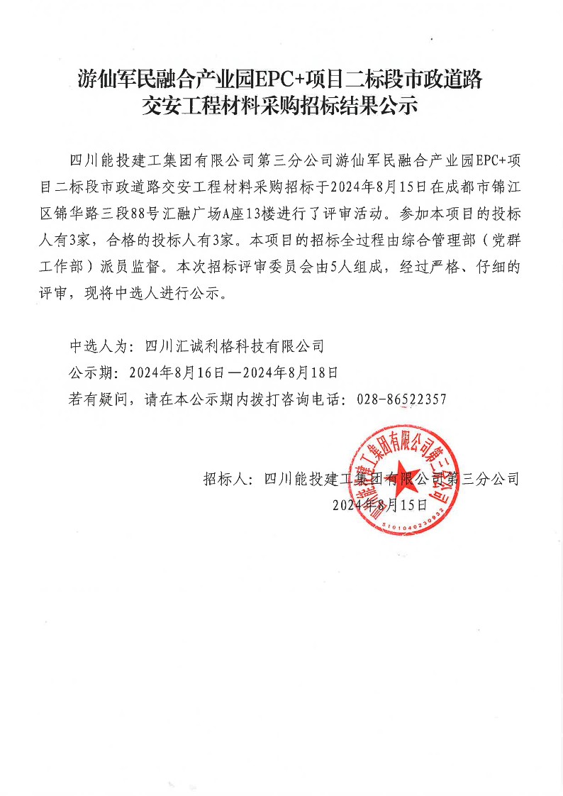 游仙军民融合产业园EPC+项目二标段市政道路交安工程材料采购结果公示