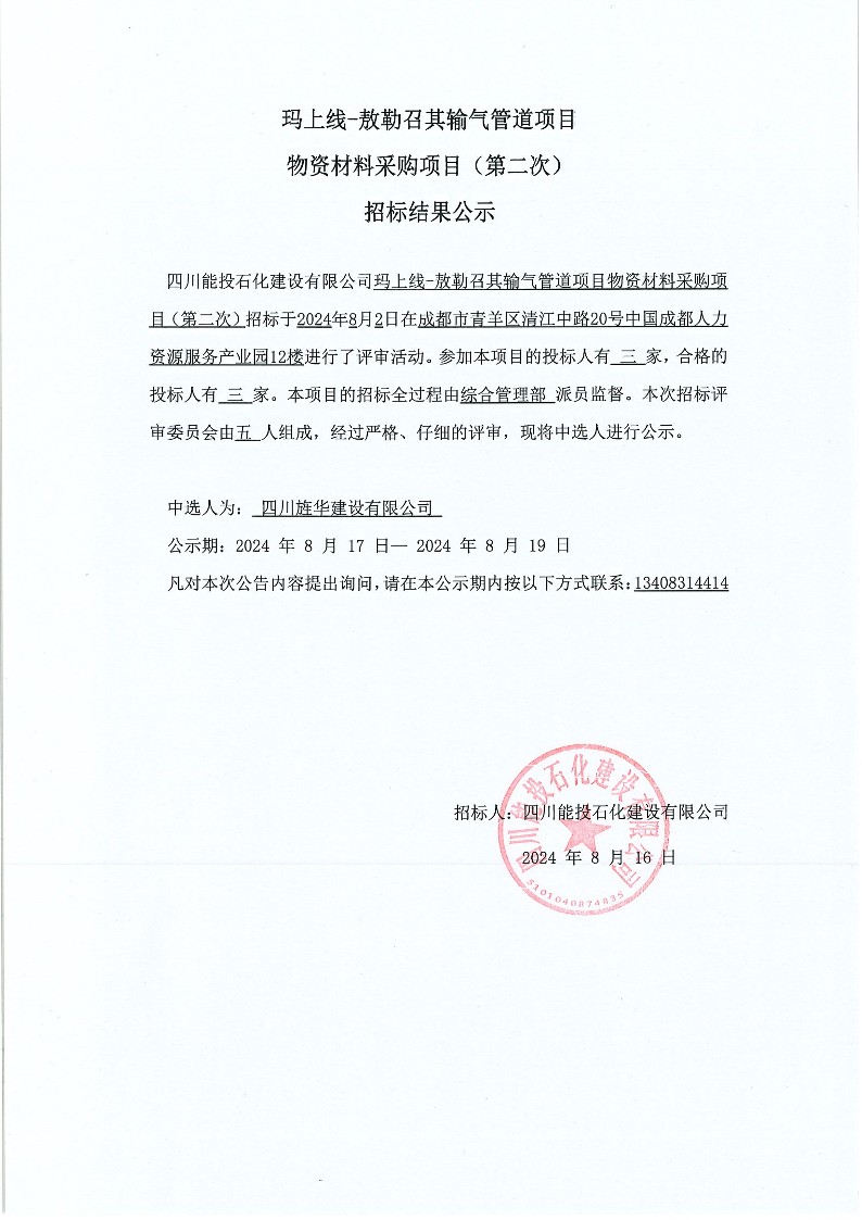 玛上线—敖勒召其输气管道项目物资材料采购(第二次)结果公示