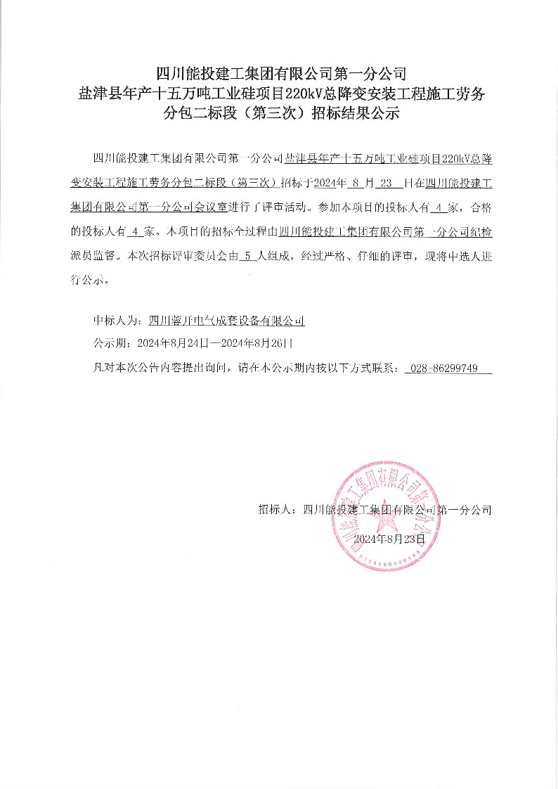 盐津县年产十五万吨工业硅项目220kV总降变安装工程施工劳务分包二标段(第三次)结果公示