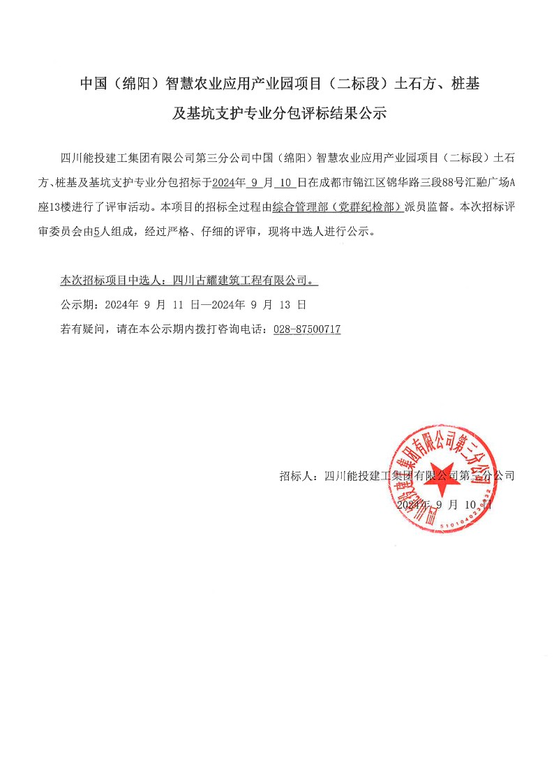 中国(绵阳)智慧农业应用产业园项目(二标段)土石方、桩基及基坑支护专业分包结果公示