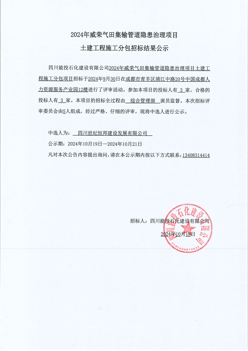 2024年威荣气田集输管道隐患治理项目土建工程施工分包招标结果公示
