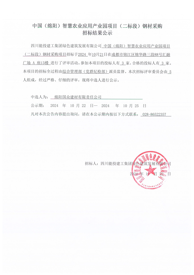 中国(绵阳)智慧农业应用产业园项目(二标段)钢材采购招标结果公示