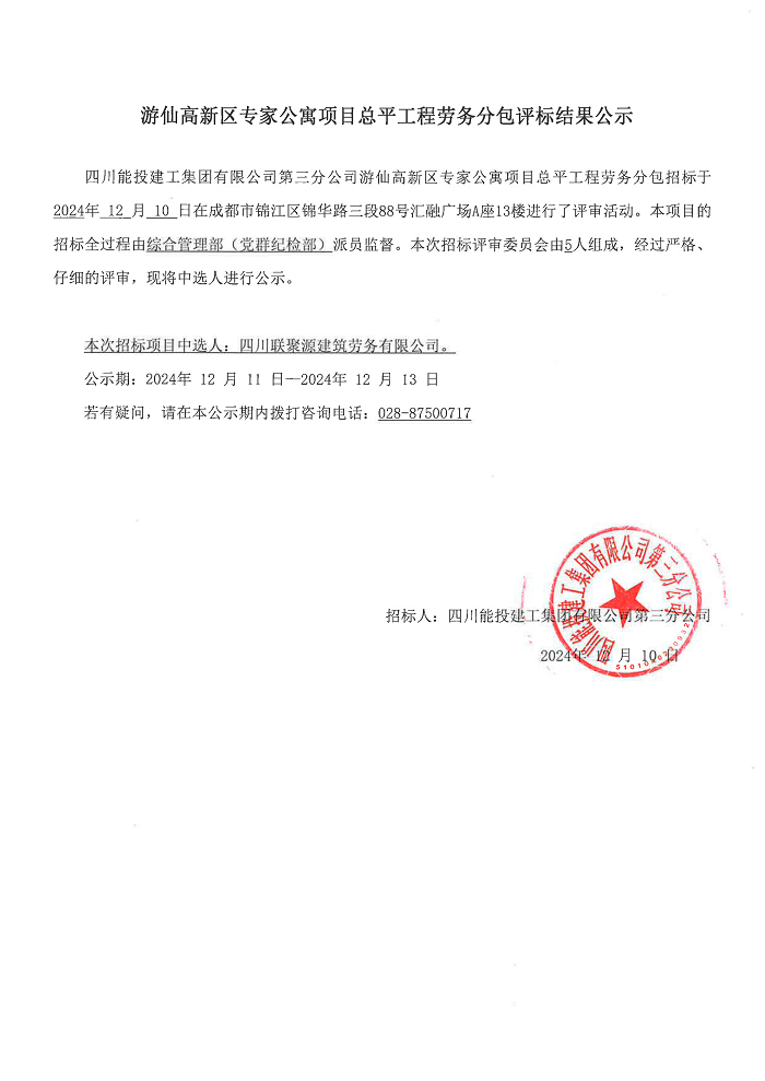 游仙高新区专家公寓项目总平工程劳务分包评标结果公示