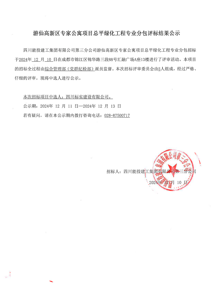游仙高新区专家公寓项目总平绿化工程专业分包评标结果公示