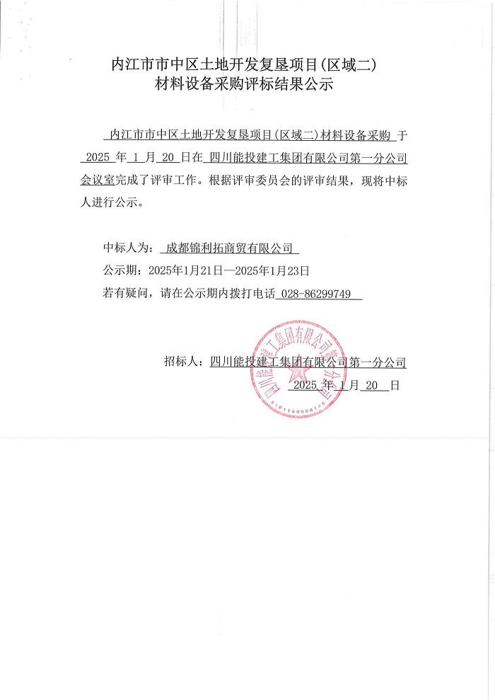 内江市市中区土地开发复垦项目(区域二)材料设备采购评标结果公示