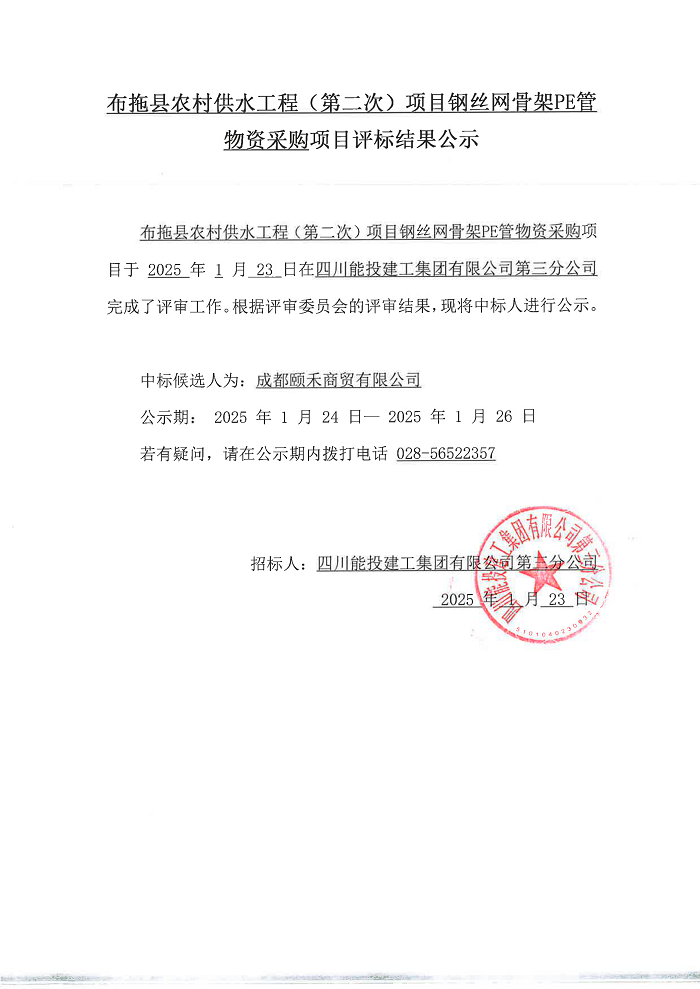 布拖县农村供水工程(第二次)项目钢丝网骨架PE管物资采购项目评标结果公示