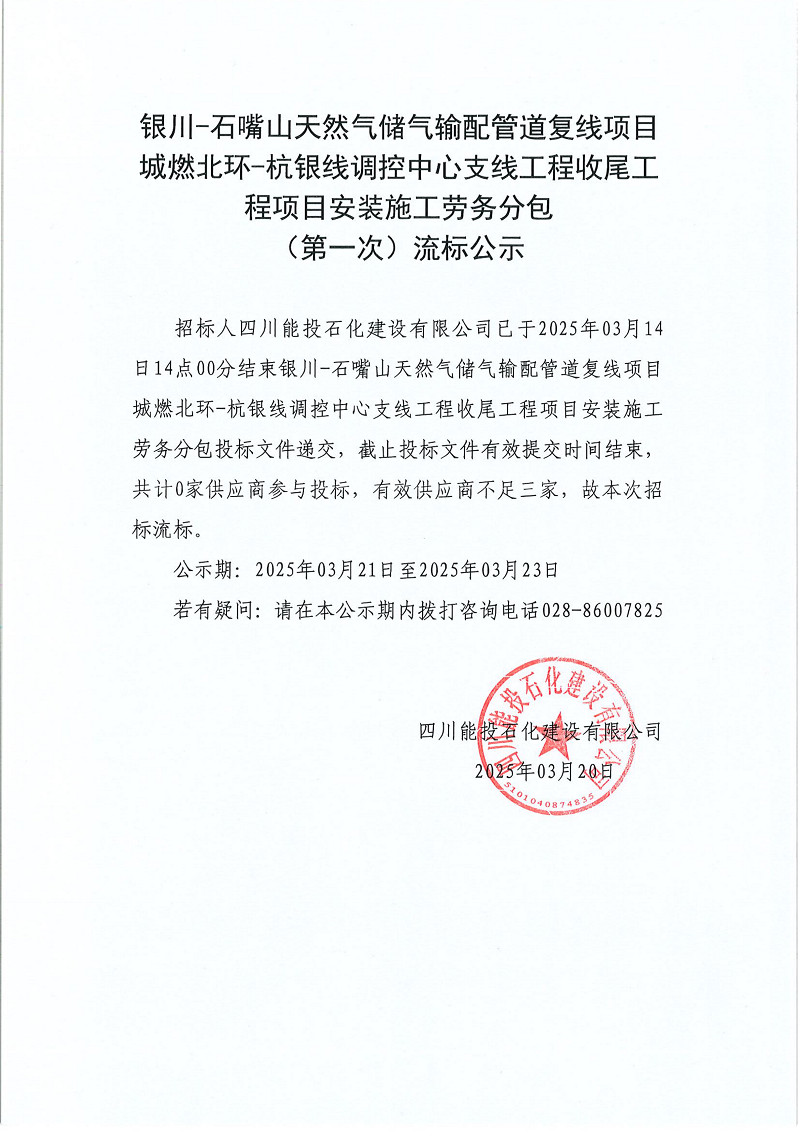 下一条:银川-石嘴山天然气储气输配管道复线项目城燃北环-杭银线调控中心支线工程收尾工程项目阀室土建及安装部分(不含工艺部分)专业分包(第一次)流标公示