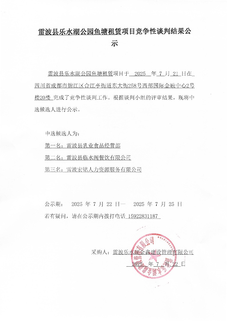 雷波县乐水湖公园鱼塘租赁项目竞争性谈判结果公示