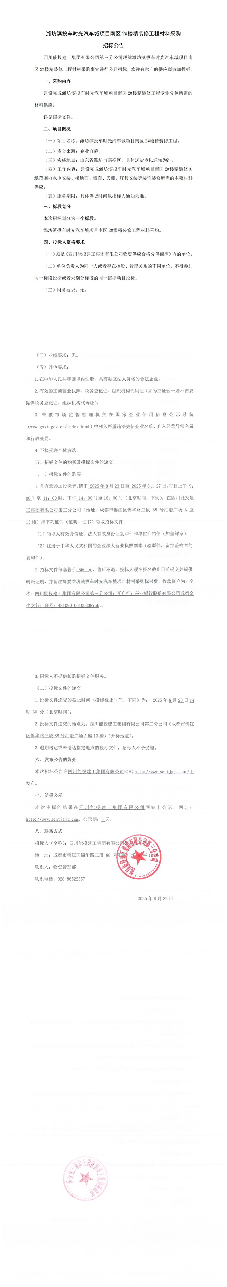潍坊滨投车时光汽车城项目南区2#楼精装修工程材料采购招标公告