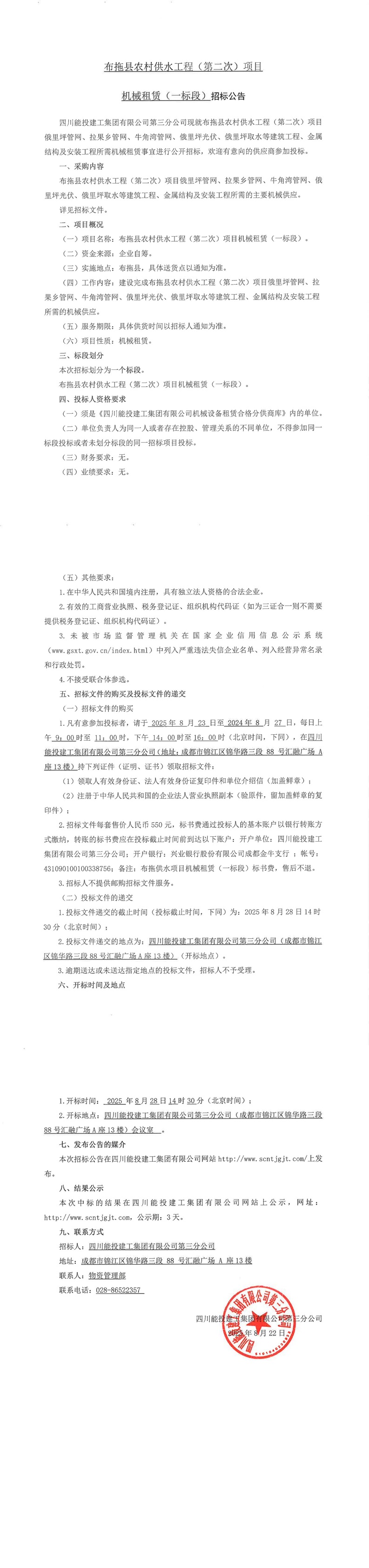 上一条:布拖县农村供水工程(第二次)项目俄里坪管网、拉果乡管网、牛角湾管网、俄里坪光伏、俄里坪取水等建筑工程、金属结构及安装工程劳务分包招标公告