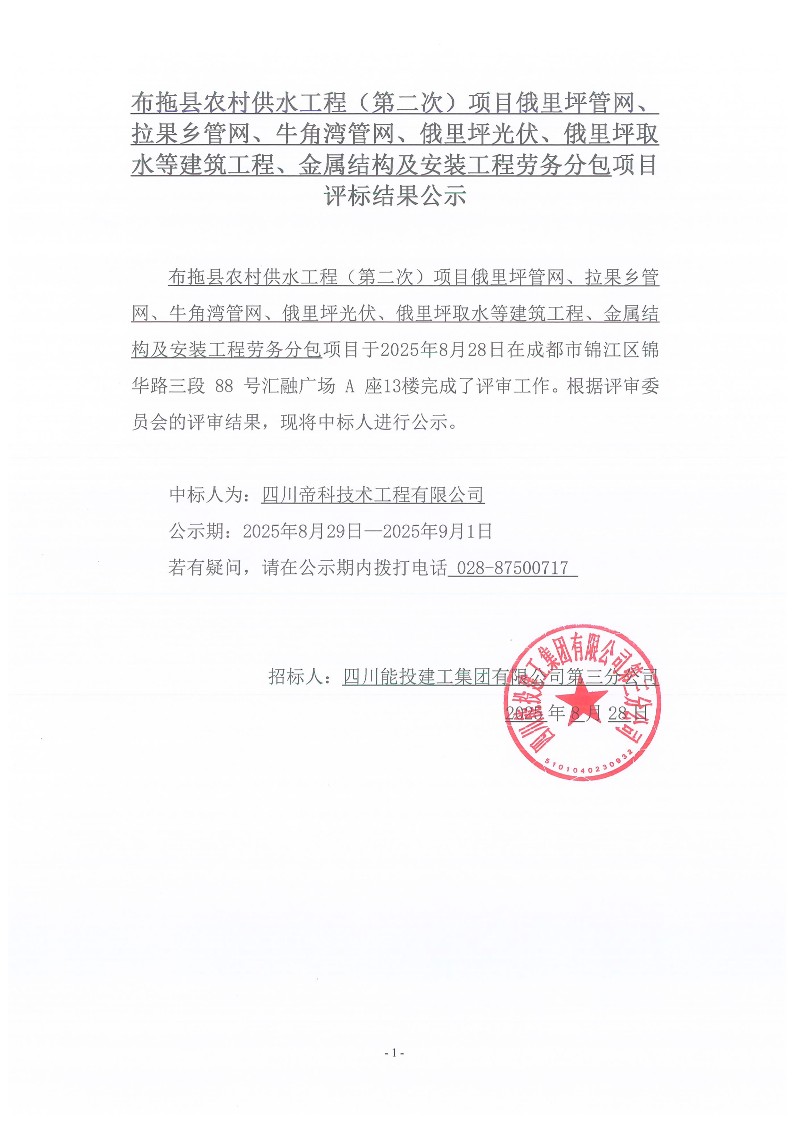 布拖县农村供水工程(第二次)项目俄里坪管网、拉果乡管网、牛角湾管网、俄里坪光伏、俄里坪取水等建筑工程、金属结构及安装工程劳务分包项目结果公示