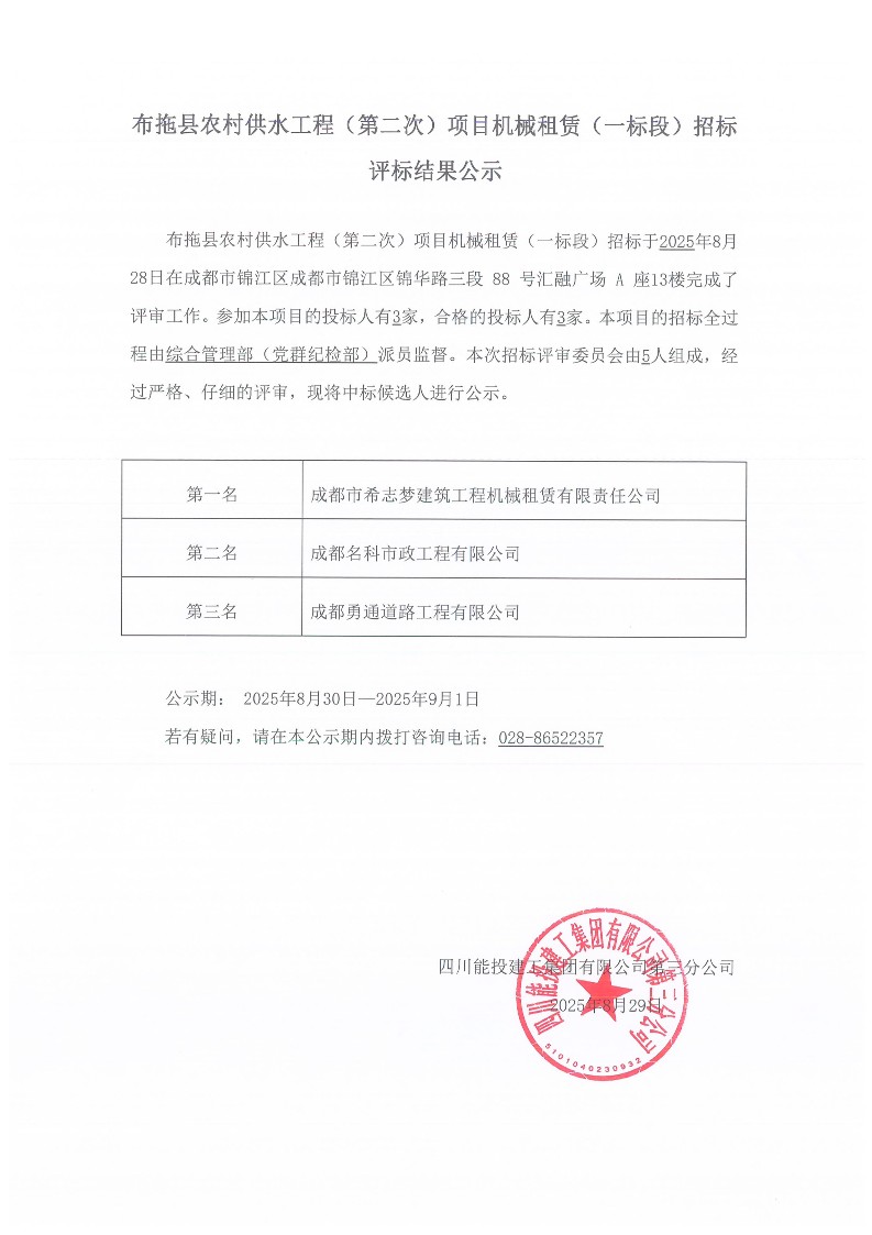 布拖县农村供水工程(第二次)项目机械租赁(一标段)结果公示
