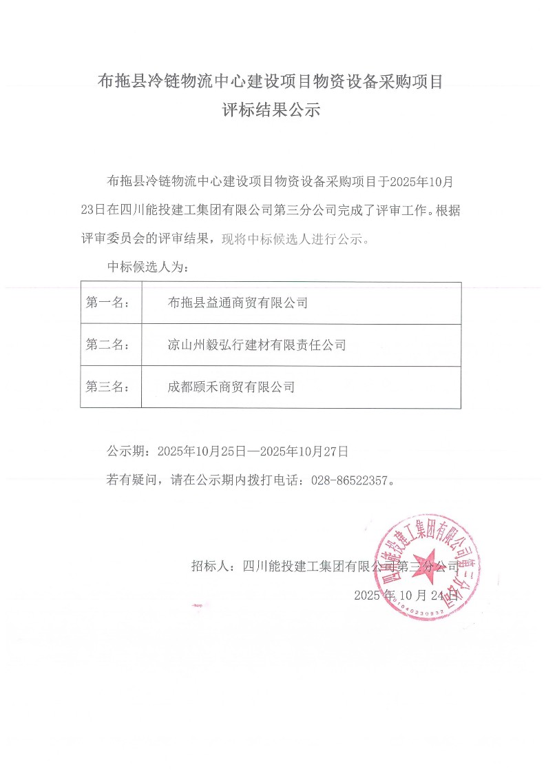 布拖县冷链物流中心建设项目物资设备采购结果公示