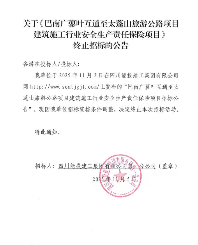 关于巴南广蓼叶互通至太蓬山旅游公路项目建筑施工行业安全生产责任保险项目终止招标的公告
