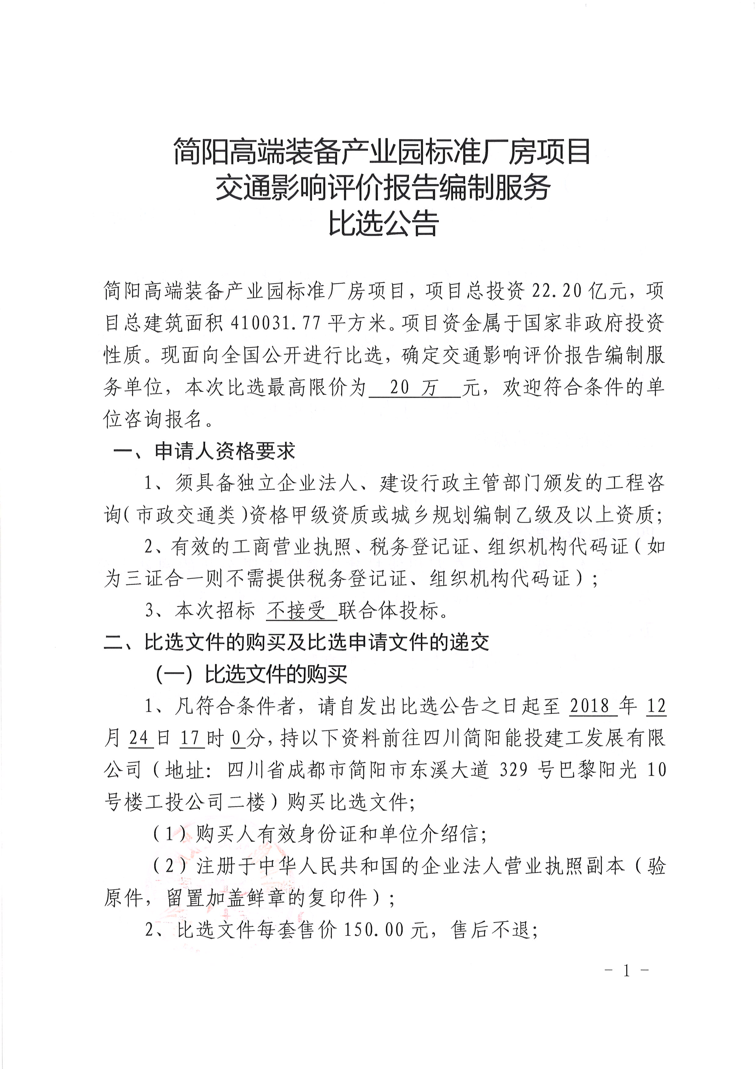 简阳高端装备产业园标准厂房项目交通影响评价报告编制服务比选公告
