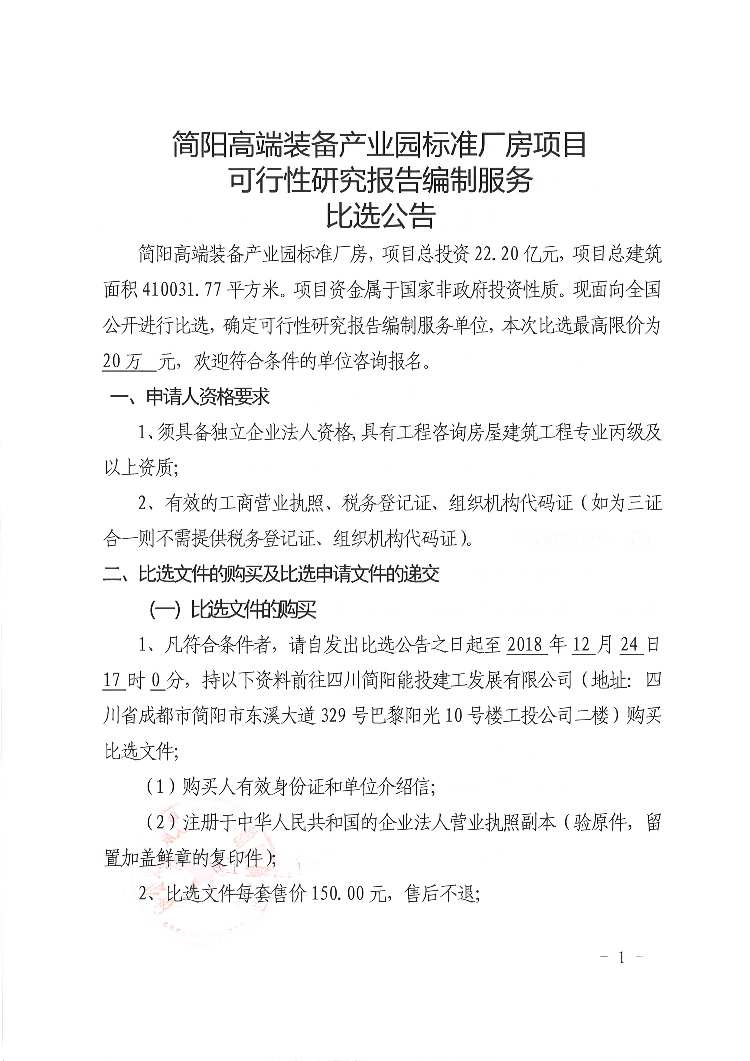 简阳高端装备产业园标准厂房项目可行性研究报告编制服务比选公告