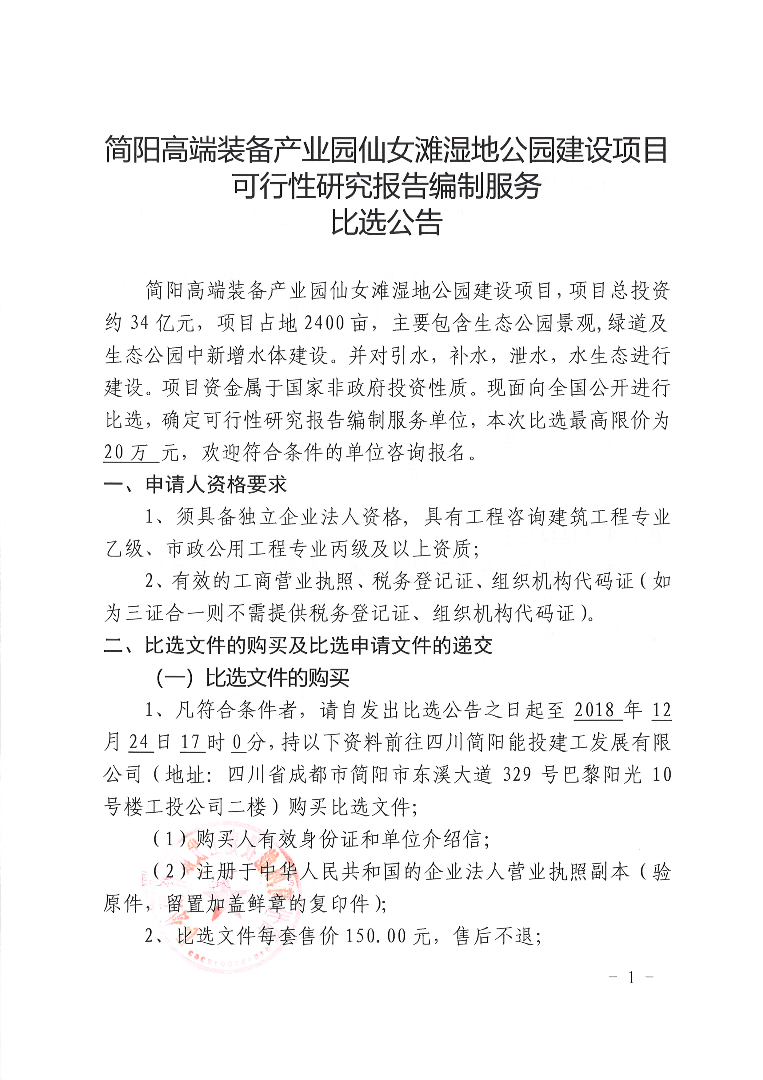简阳高端装备产业园仙女滩湿地公园建设项目可行性研究报告编制服务比选公告