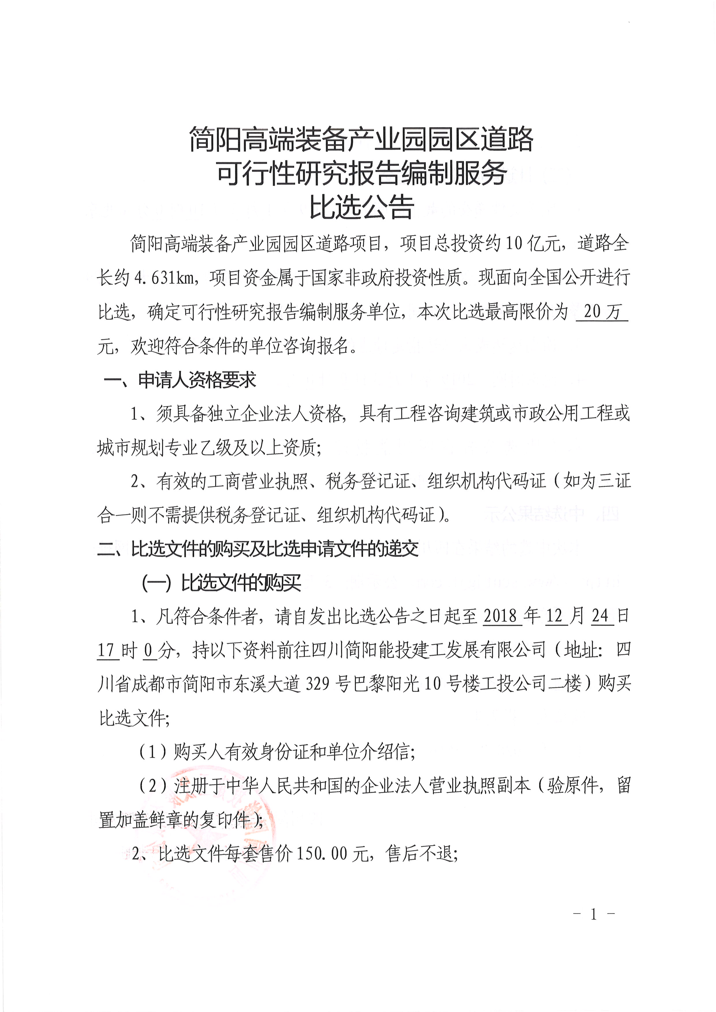 简阳高端装备产业园园区道路可行性研究报告编制服务比选公告