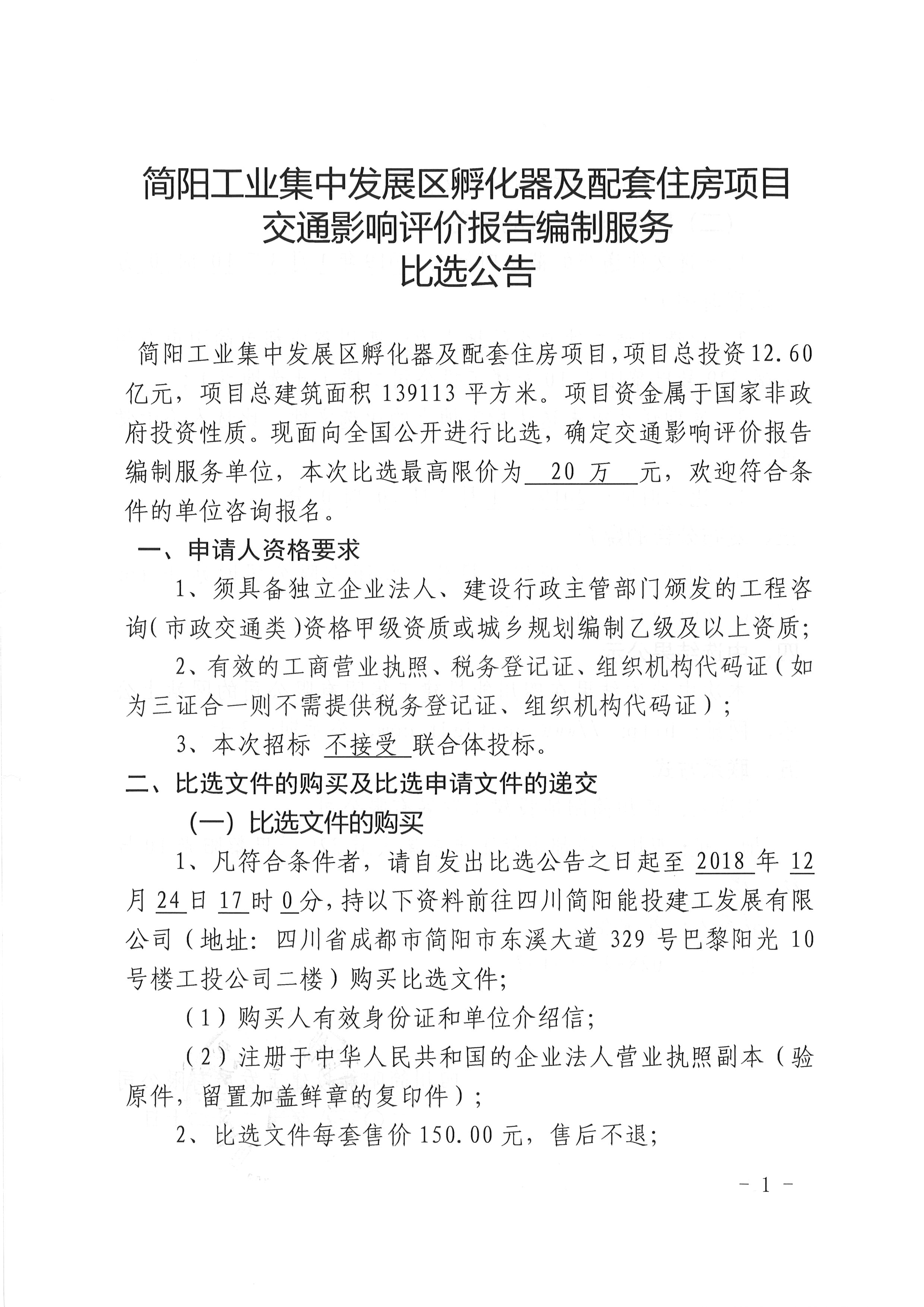 简阳工业集中发展区孵化器及配套住房交通影响评价报告编制服务比选公告